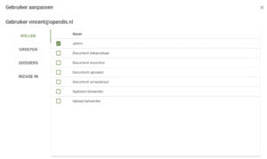 In dit overzicht koppel je de externe gebruikers (OnView) aan de OpenDIS-gebruikers. Daarnaast kun je hier de rollen van een gebruiker toewijzen en gebruikers koppelen aan groepen en/of dossiergroepen.